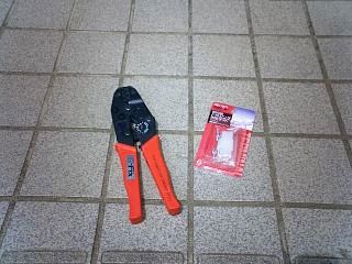 早速、交換用の250型2極コネクタを買ってきました、左側にあるのは250型コネクタを圧着するための工具です。
